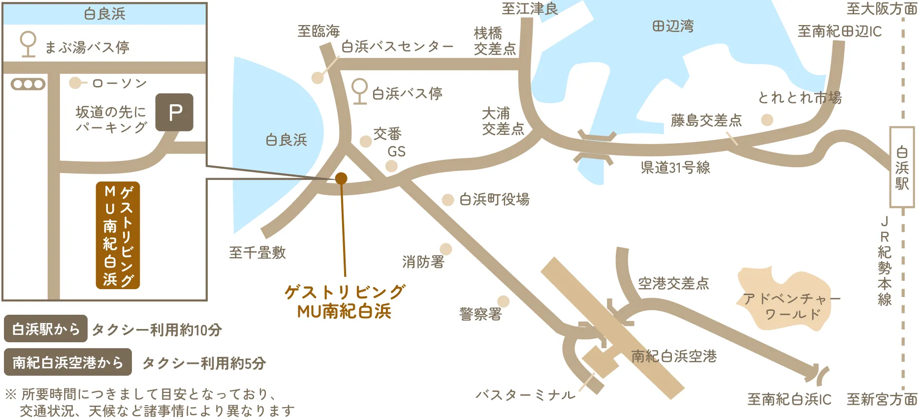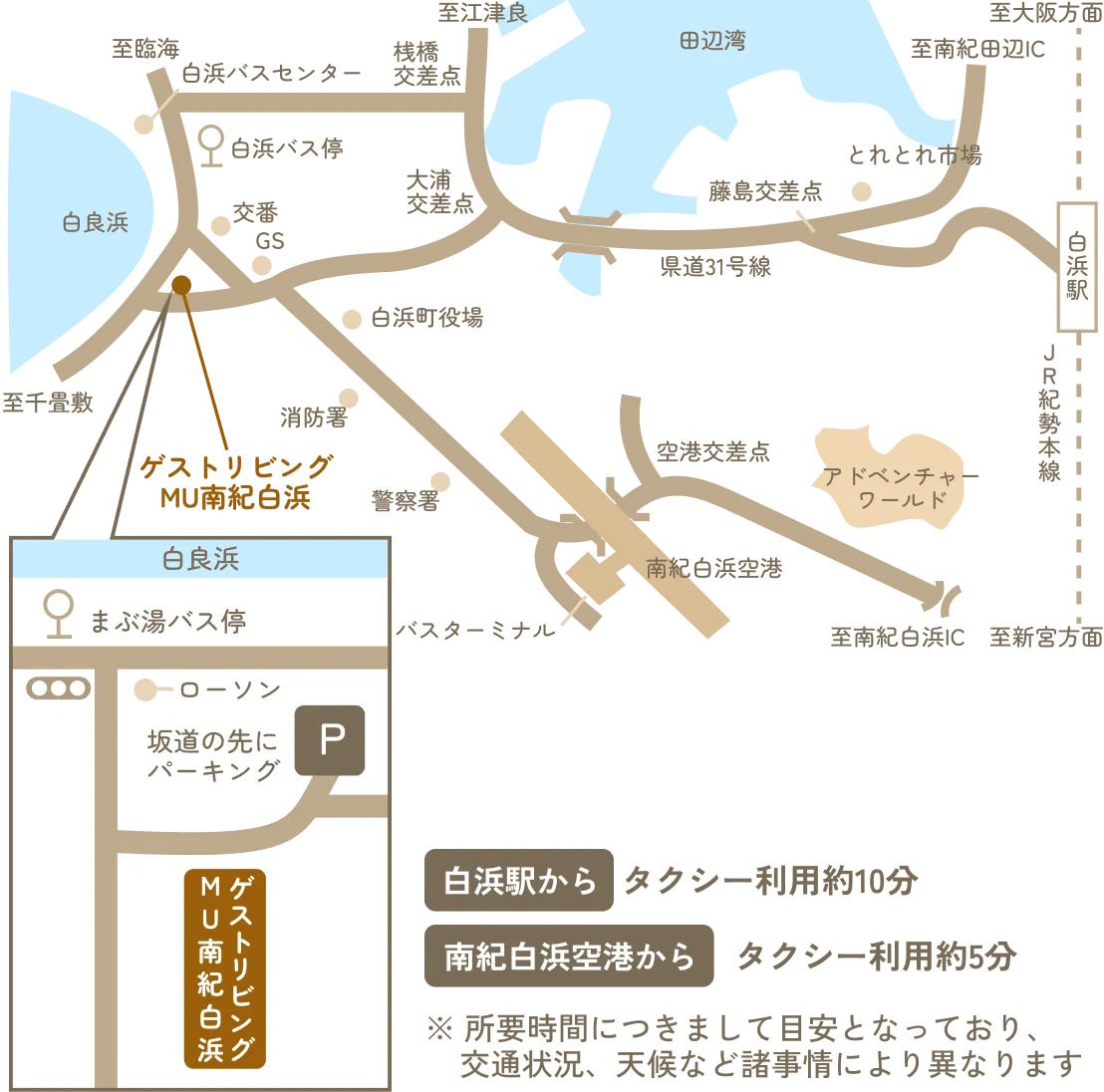 シーパーキング白浜と当館の間の細い路地を50m進んだ場所に駐車場がございます。